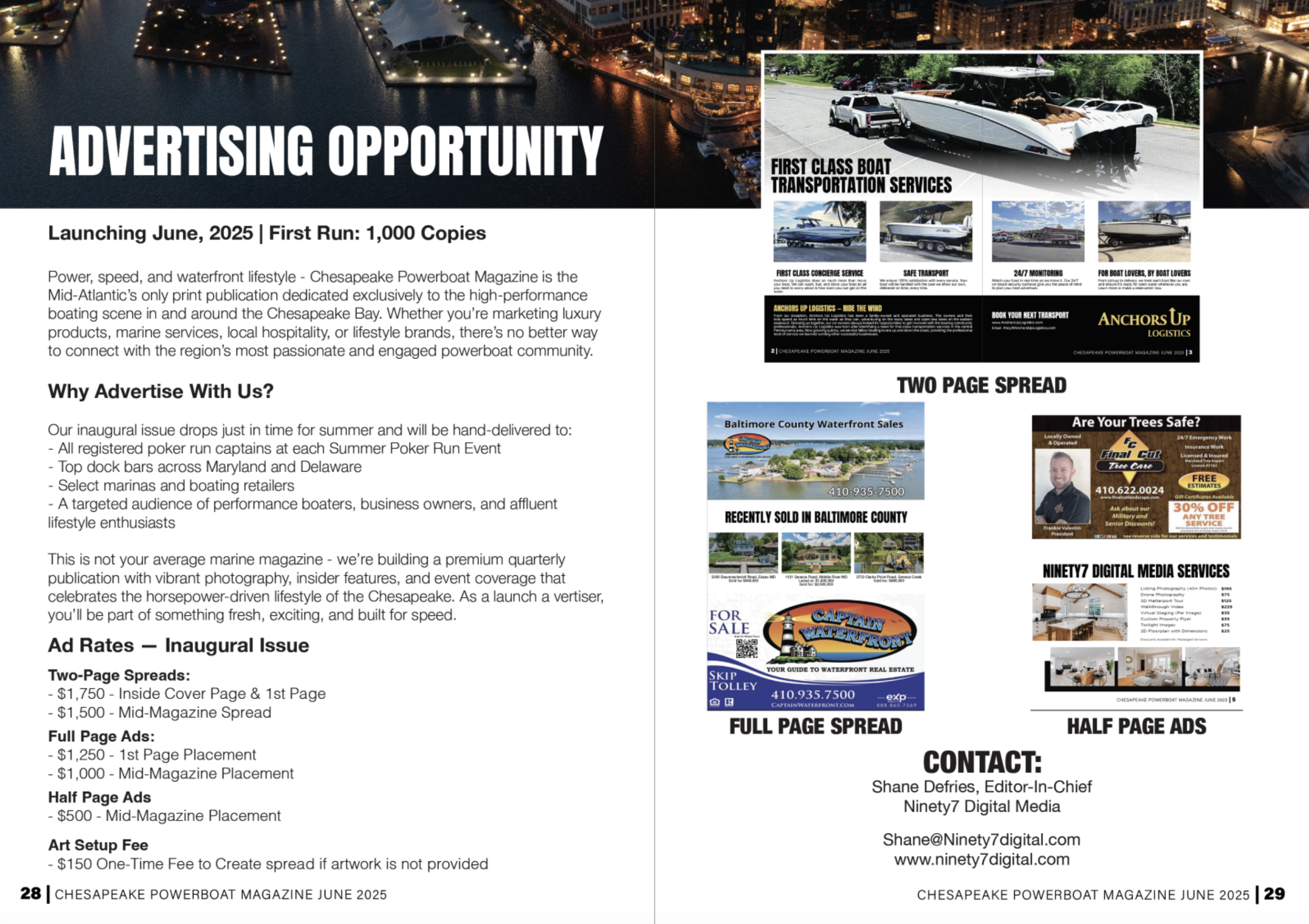 If you’re holding this magazine in your hands (or scrolling through it on your phone), you’re part of something new—and something long overdue. Chesapeake Powerboat Magazine was born from one simple truth: the Mid-Atlantic performance boating scene is thriving, but no one was really telling its story. The Chesapeake Bay, with its rugged beauty and high-performance culture, has been underrepresented in mainstream marine media for too long. So I decided to do something about it. With over six years of experience behind the camera at poker runs, shootouts, and dock parties, and seven years in the digital marketing world, I’ve been fortunate enough to document more than 35 boating events up and down the East Coast. And no matter where I go, I always come back to this: there’s something special about the Chesapeake. The community, the boats, the backdrop—it deserves a platform that reflects its energy, speed, and soul. This magazine is for the people who wake up early to chase glassy water. It’s for the weekend warriors who put in the hours all week just to light up the Bay on Saturday. It’s for the captains, the crews, the photographers, the dock bar regulars, and everyone else who feels at home with outboards humming beneath their feet. In every issue, you’ll find stories that highlight the boats, the builders, the events, and—most importantly—the people that make this scene so electric. From shootout recaps and featured builds to dock bar culture and offshore legends, we’re building a publication that speaks your language and lives your lifestyle.